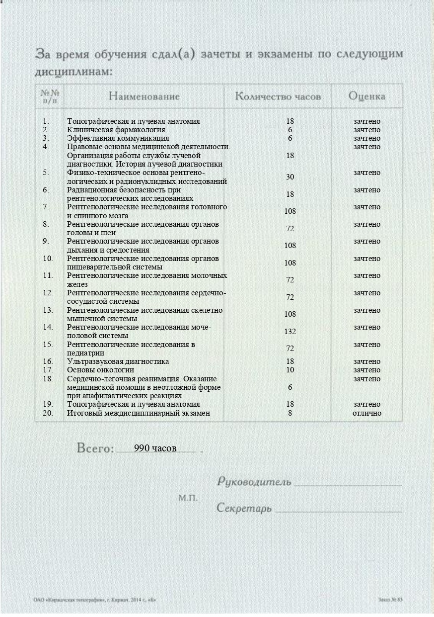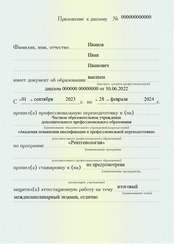 По окончанию обучения на курсе профессиональной переподготовки по «Рентгенологии» выдаётся диплом о профессиональной переподготовке с правом ведения деятельности и с присвоением квалификации «врач-рентгенолог». Информация о выданном дипломе также вносится в Федеральный реестр документов об образовании.
