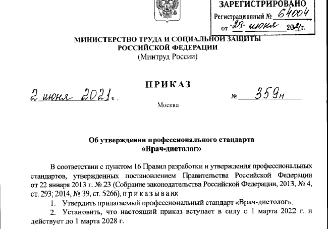 15 июля 2021 г. опубликован новый профстандарт врача-диетолога