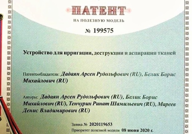 «Подробнее»Дадаян Арсен Рудольфович, хирург, врач узи, врач высшей категории, председатель итоговой аттестационной комиссии по программам профессиональной переподготовки и повышения квалификации в сфере здравоохранения АПКиПП в соавторстве с Б. М. Беликом, Р. Ш. Тенчуриным и Д. В. Мареевым 8 сентября 2020 года получил патент №199575 «Устройство для ирригации, деструкции и аспирации тканей».